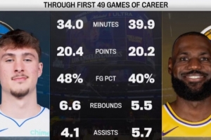 (在相对更少的出场时间里,弗拉格得分、命中率、篮板都优于詹姆斯)