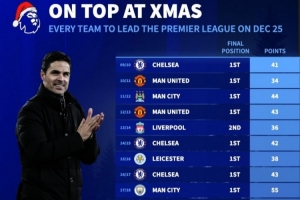 德转列近年英超联赛圣诞榜首球队积分:近7年仅3队最终夺冠