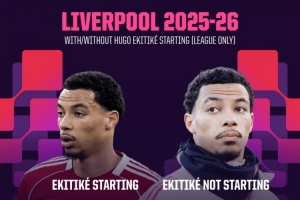 数据统计显示,埃基蒂克本赛季英超首发情况下,利物浦10场7胜1平2负,场均打进2球、获得2.2分。