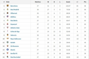 西甲2025年度积分榜:巴萨96分居首,皇马86分次席,马竞第4