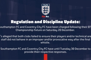 英足总发布公告,确认南安普顿与考文垂因12月20日英冠赛后行为被正式指控。两家俱乐部均未能确保其球员及/或技术区工作人员在终场哨响后避免不当及/或挑衅性行为。南安普顿与考文垂需在12月30日前各自提交回应。