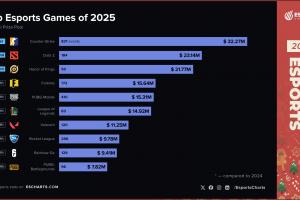 体育资讯12月26日讯 Esports Charts统计2025年总奖金池最多的电竞赛事前十名: