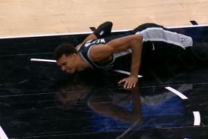 今日马刺134-132战胜尼克斯的比赛第四节,文班抢篮板落地时,大腿和克拉克森有个碰撞,导致左腿落地不适,左膝似乎有些过度伸展,他随后一瘸一拐返回更衣室。但最后时刻文班返回了替补席为队友加油,没有上场。