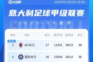 最新的积分榜方面:米兰先赛2分优势登顶,积36分排名第2的国米1月5日凌晨主场迎战博洛尼亚,那不勒斯第3、罗马第4。