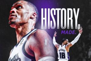 比赛第四节,国王后卫拉塞尔·威斯布鲁克突破上篮得手,得到本场比赛第17分,个人生涯总得分来到26711,超越奥斯卡·罗伯特森(26710)升至NBA历史得分排行榜第15位,成为NBA历史控卫得分王!