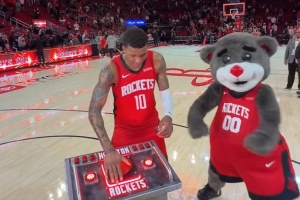 赛后,小贾巴里·史密斯出席火箭主场的新仪式,拍下按钮让火箭升空。