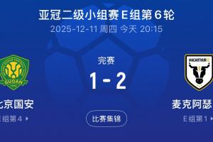 体育资讯12月11日讯 亚冠二级小组赛E组第6轮,北京国安1-2输给麦克阿瑟FC。本轮中超球队亚冠赛场表现,海港、蓉城战平,国安、申花失利。