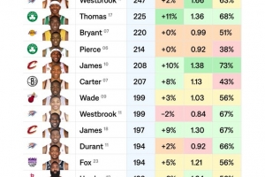 rTS%:与自己赛季真实命中率的差值