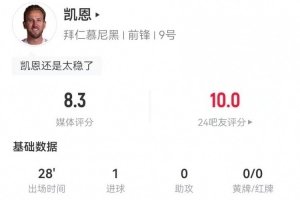 凯恩替补2射2正进1球+1失良机 2长传2成功+6对抗5成功 获评8.3分