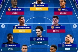 中场:贝林厄姆(皇马)、维蒂尼亚(巴黎)、佩德里(巴萨)