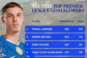 体育资讯12月14日讯 在本轮英超切尔西2-0击败埃弗顿的比赛中,帕尔默破门。切尔西官方也晒出了队史英超射手榜,帕尔默升至第9,具体榜单如下: